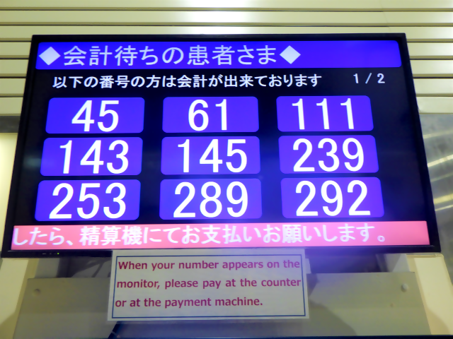 診療費精算機コーナーのモニター画面に受付票の番号が表示されましたら、精算機にてお支払いをお願いします。