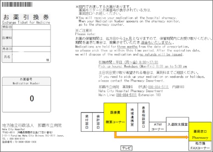 院内薬局にてお薬をお受け取りになれます。診療費の領収書と一緒に「お薬引換券」が発行されますので、薬局窓口近くのモニター画面にお薬番号が表示されましたら、窓口で「お薬引換券」と引き換えにお薬を受け取りください。
