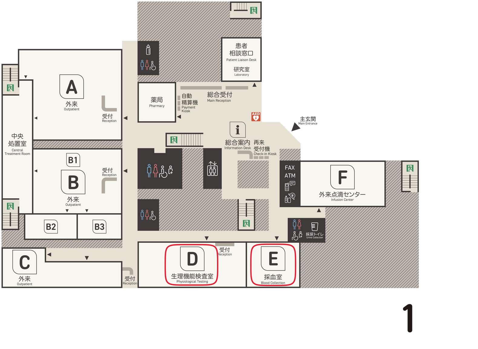 検査科(採血・検体検査・生理検査)の受付は1階です。